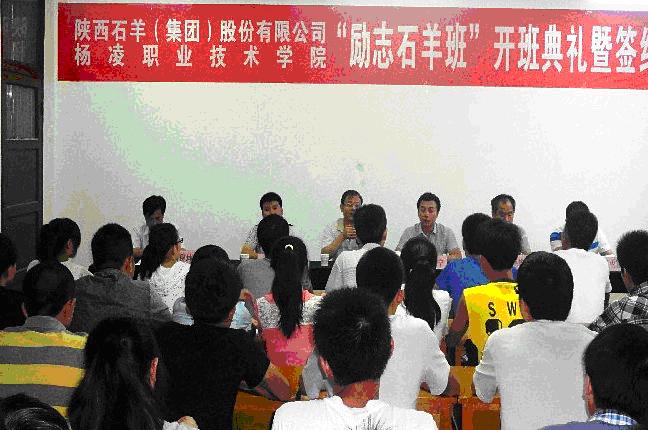 會上,楊凌職業技術學院動物工程學院王書記對第二屆“勵志石羊班”的開班表示熱烈祝賀,對石羊集團給予學校教學改革的支持表示感謝,對校企合作所取得的成績做了充分肯定,對加入訂單班的學生提出了幾點要求。周博寧總經理簡要介紹了石羊集團情況,對加入石羊班的同學表示歡迎,勉勵同學們要珍惜機會,努力學習,早日成才。