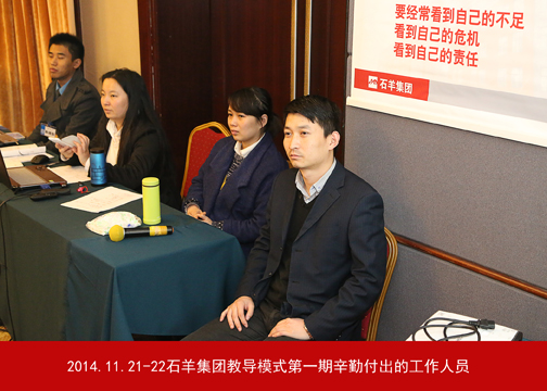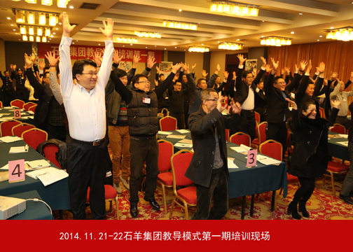 11月20日—22日,石羊集團教導培訓第一期在未央湖畔的度假酒店成功舉行。按集團董事長魏存成在2014年第三季度經營檢討會上的部署,本次活動旨在向各事業部主管級以上人員傳達、推廣教導模式。此次培訓得到了大量教導家人的支持,現場邀請到師道書院汪蓉老師,同時還感召到王亞妮、丘煒等企業家人作為教導員。此次培訓學員分別來自匯邦地產、金融、農牧、大食品及外部學員共計75人,培訓導師、教導團和小天使人員30余人。
