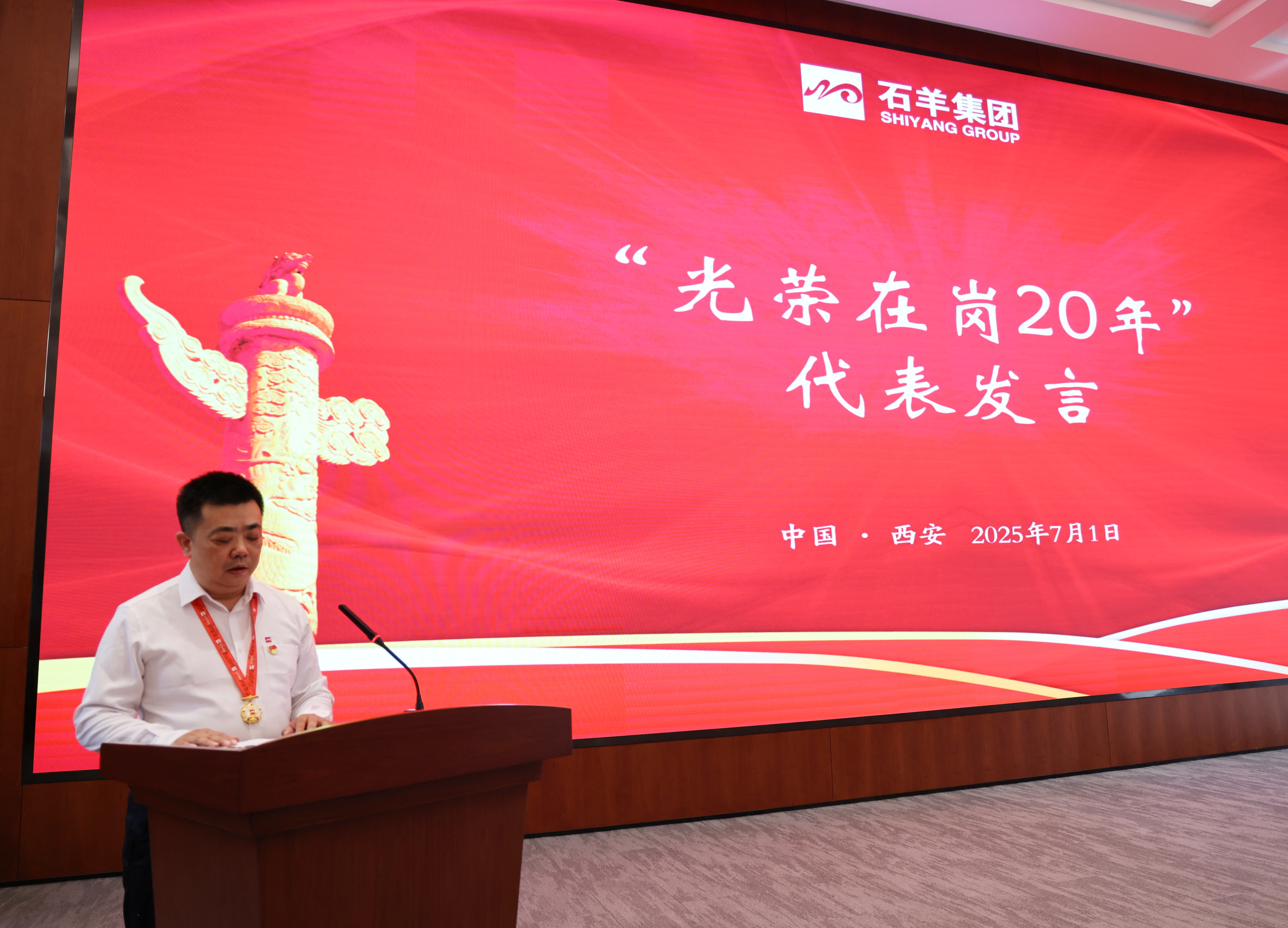 接下來,對在崗二十年員工進行表彰,頒發“光榮在崗20年獎章”。20年相伴相隨,石羊人將青春與熱血融入企業發展歷程,在各自崗位上默默耕耘、無私奉獻。當沉甸甸的獎章掛在胸前,閃耀的不僅是榮譽的光芒,更是他們20年如一日堅守與付出的見證,贏得了全場熱烈的掌聲與由衷的敬意。